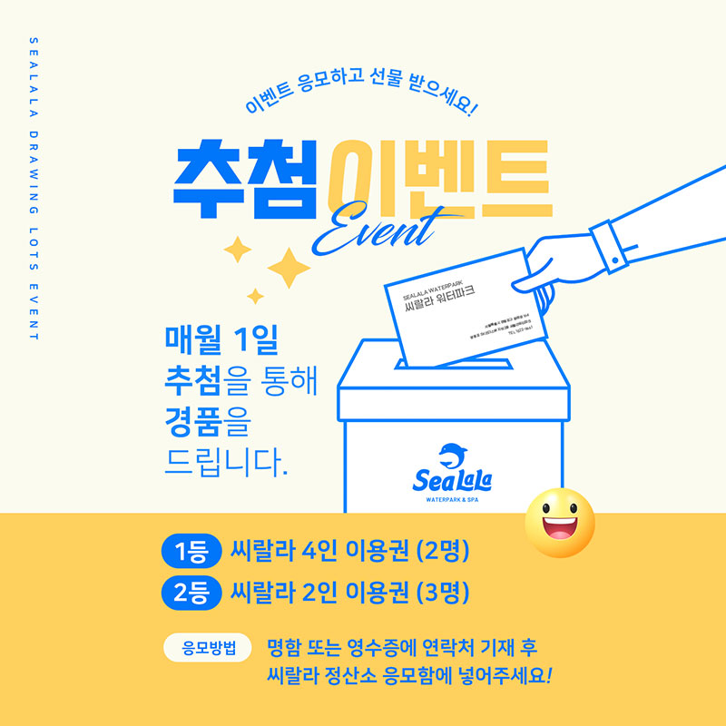 씨랄라 상시 이벤트 이벤트 기간 2026/01/29 ~ 계속 조회수5738 SPECIAL EVENT & PROMOTION 씨랄라 상시 이벤트 씨랄라 이용 고객님을 위한 스페셜 혜택 이벤트 기간 : 2026/01/29 ~ 계속 TEL : 1522-9661 목록 이전 이벤트 이전 이벤트가 없습니다. 다음 이벤트 다음 이벤트가 없습니다.